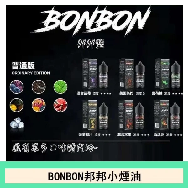 口味: 西柚 红冰 山楂 混合水果 惡魔之吻 薄荷糖 菠萝椰汁 西瓜冰 莓果廚師 混合蓝莓 法式檸檬派 今夜無飲 小芒芒 七星菸草薄荷 黑牌煙草 王牌煙草 曲奇煙草 黑標五木煙草 小綠人